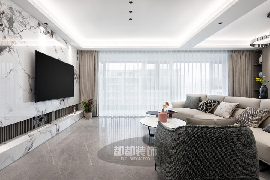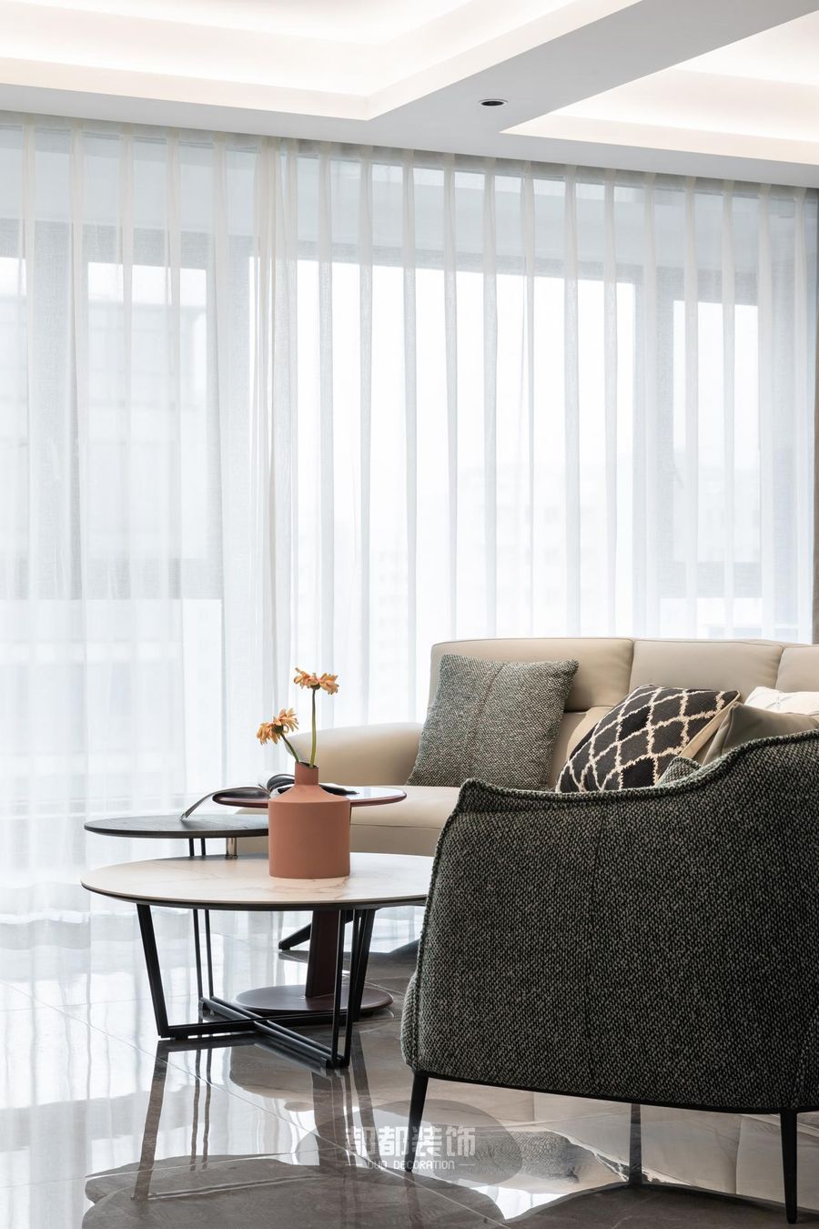 客厅以奶茶色为基调,纯粹的白色吊顶和纱窗塑造出素雅的视觉氛围,随着日光洒落缓缓升温,温暖、舒缓被最大程度地释放到空间里。