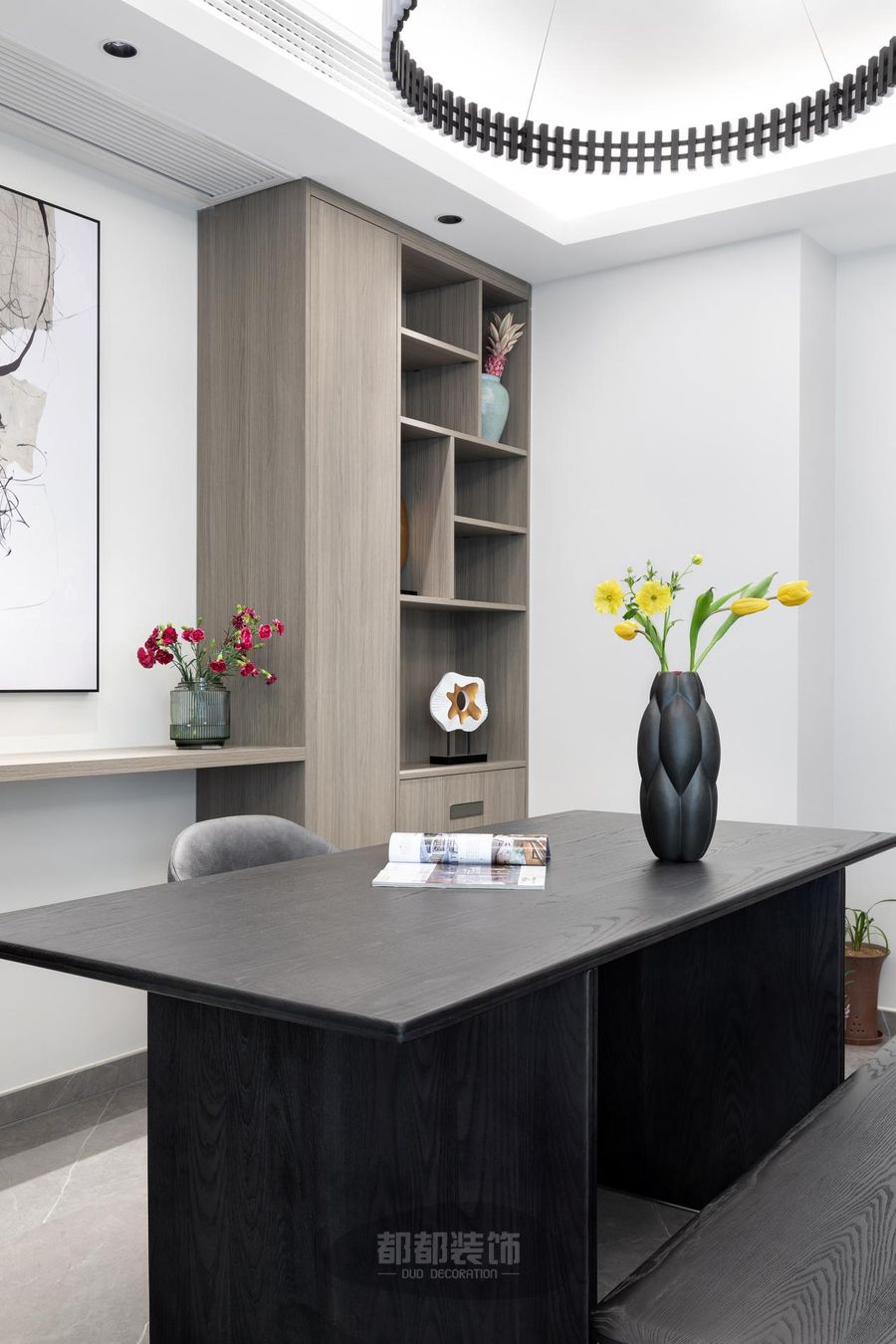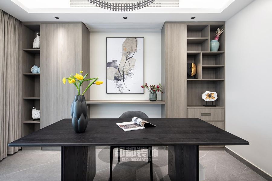 简约大方的书桌台,原木储物柜排列着精美有序的陶瓷艺术品,再加以泼墨装饰画和黄色郁金香点缀,打造出一个实用性和观赏性兼备的办公空间,烘托出平淡、纯粹的格调氛围。