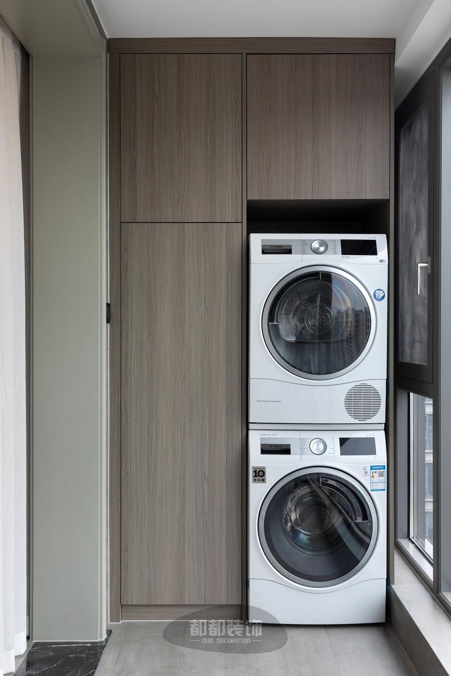 生活阳台需要满足洗衣晾晒和收纳物品的功能,将洗衣机和烘干机嵌入阳台柜,营造出宽敞明亮的阳台空间;将洗漱台安置在阳台上,就能分担卫生间洗漱的压力,在阳台也能开启新的一天。
