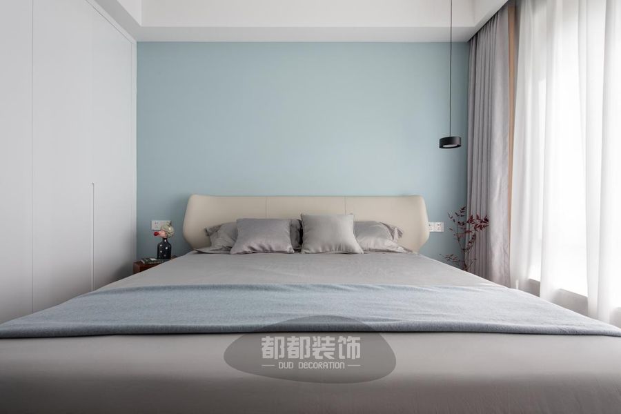 主卧地面通铺木地板,浅蓝色背景墙与温柔的床品相呼应,柔和且宁静。黑色金属吊灯,线条感流畅,给空间注入满满时尚感。