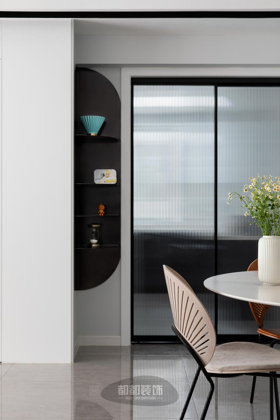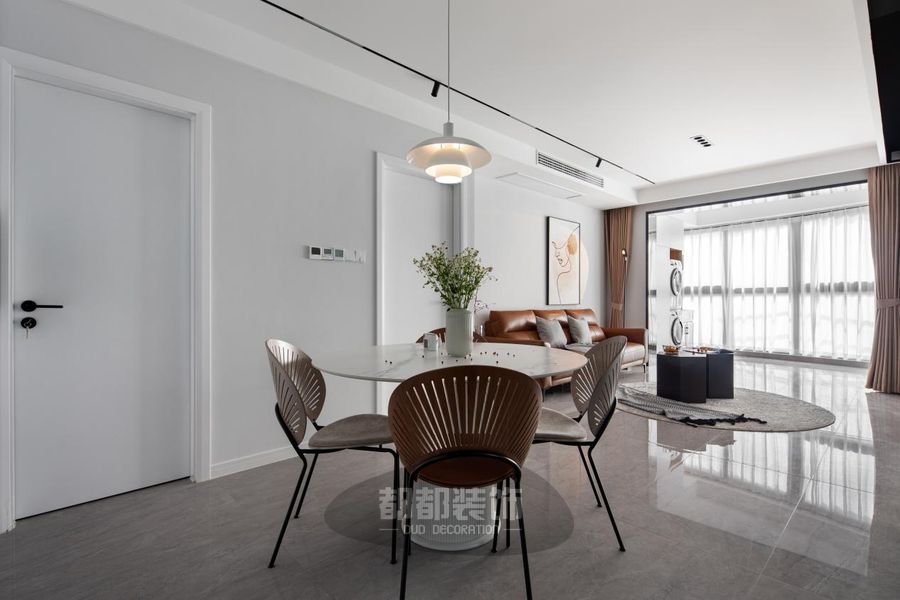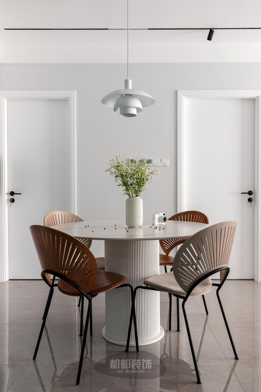 铁艺椅脚+实木靠背打造而成的贝壳椅,餐桌采用岩板桌面+罗马柱纹理桌腿设计,不仅有颜还有料。小雏菊盆栽加以点缀,散发着清新自然的韵味。