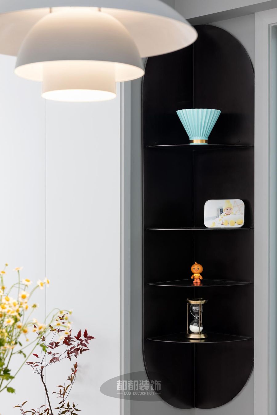 墙面上还做了个收纳柜,可以放些精美餐具和宝宝相册做展示,灯光一亮,活脱脱成了—件装饰品,瞬间提升档次。