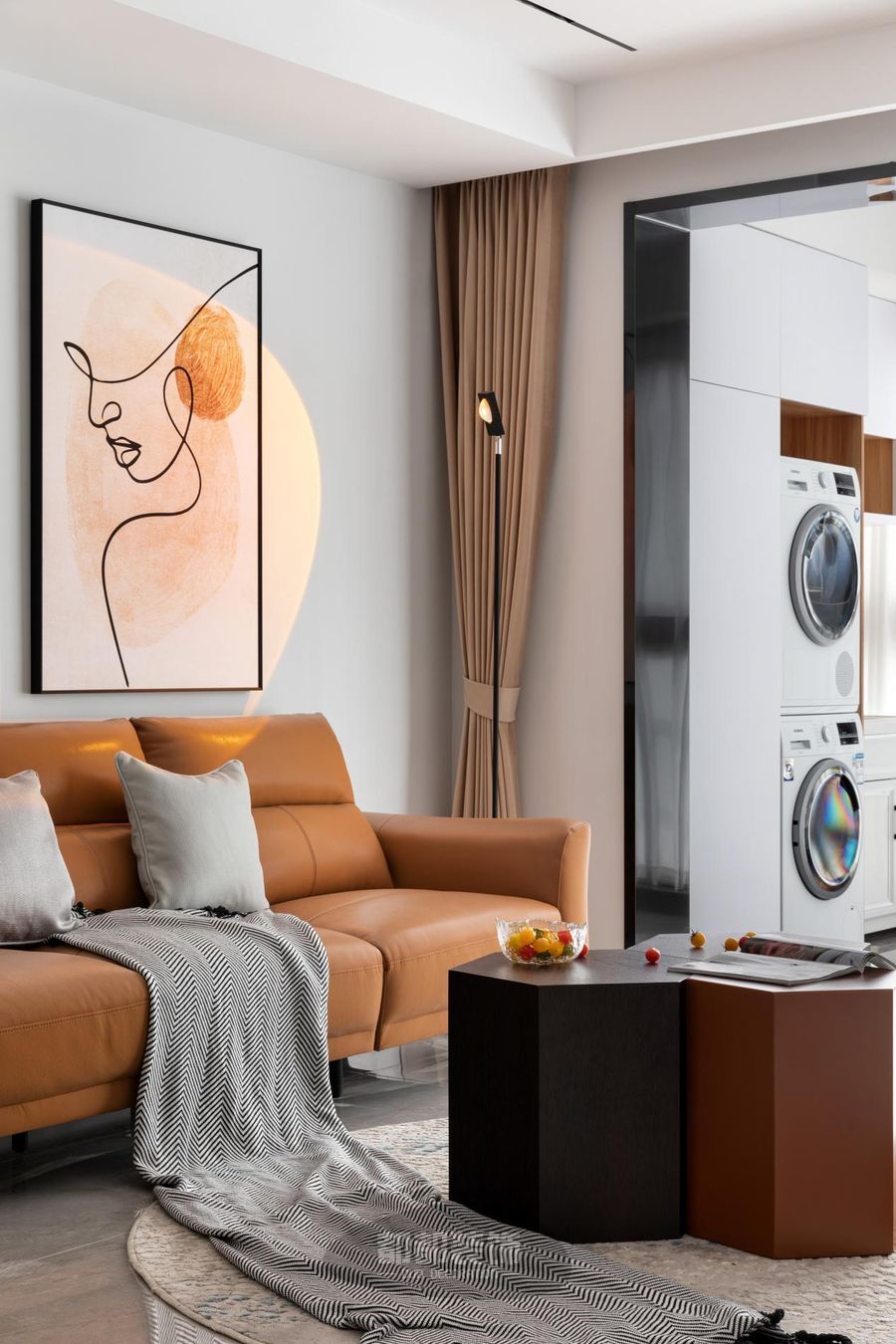 沙发采用舒适柔软的纯棉面料+皮质面料,灰色+橙色搭配起来有强烈的视觉冲击力,整个客厅顿时活力满满,上方的简约装饰画搭配落日灯,现代、前卫。