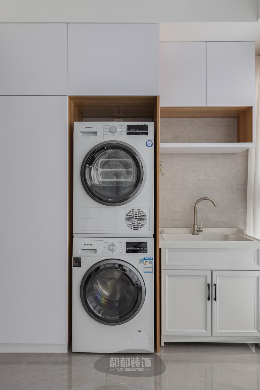 乳白色为主的阳台柜搭配着洗手盆、洗衣机、烘干机,隐藏着强大的收纳空间,满足了现代生活的需求。