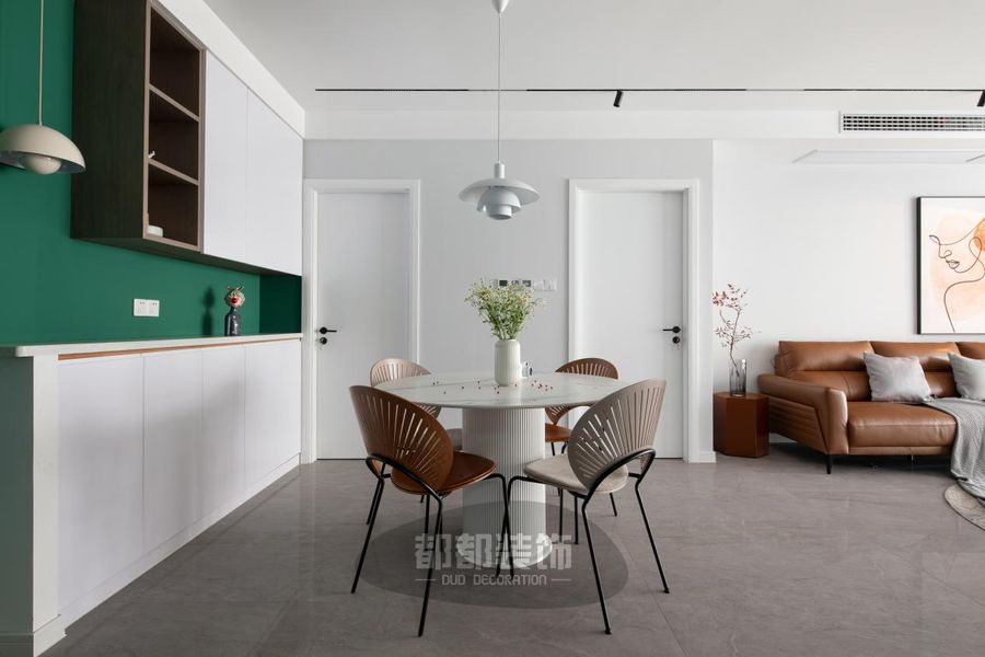 餐厅中加入了金属元素,自带光芒,点缀现代白色花苞吊灯,创意满满,让简约的餐厅呈现多元化,墨绿色墙面配合着原木柜体,也让空间的层次和色调更加丰富。