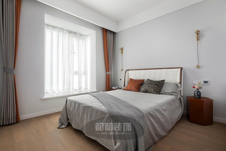窗帘和靠枕的亮橙色正好中和了灰白调的清冽感,为居室注入一抹恰到好处的温柔与温度。床头两边装饰金色全铜壁灯,氛围感升级。