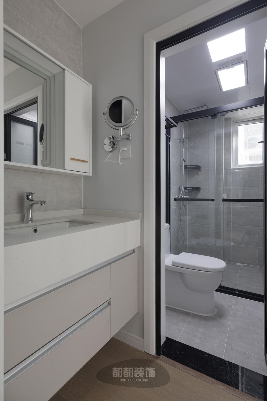 卫生间做了干湿分离,把淋浴区、洗漱区、马桶区这三个功能区域划分明显。地面用的是浅灰色大理石瓷砖,若隐若现的纹理在砖面上更有质感;外观简洁的化妆柜和墙面上的瓷砖相映衬,和谐统—。