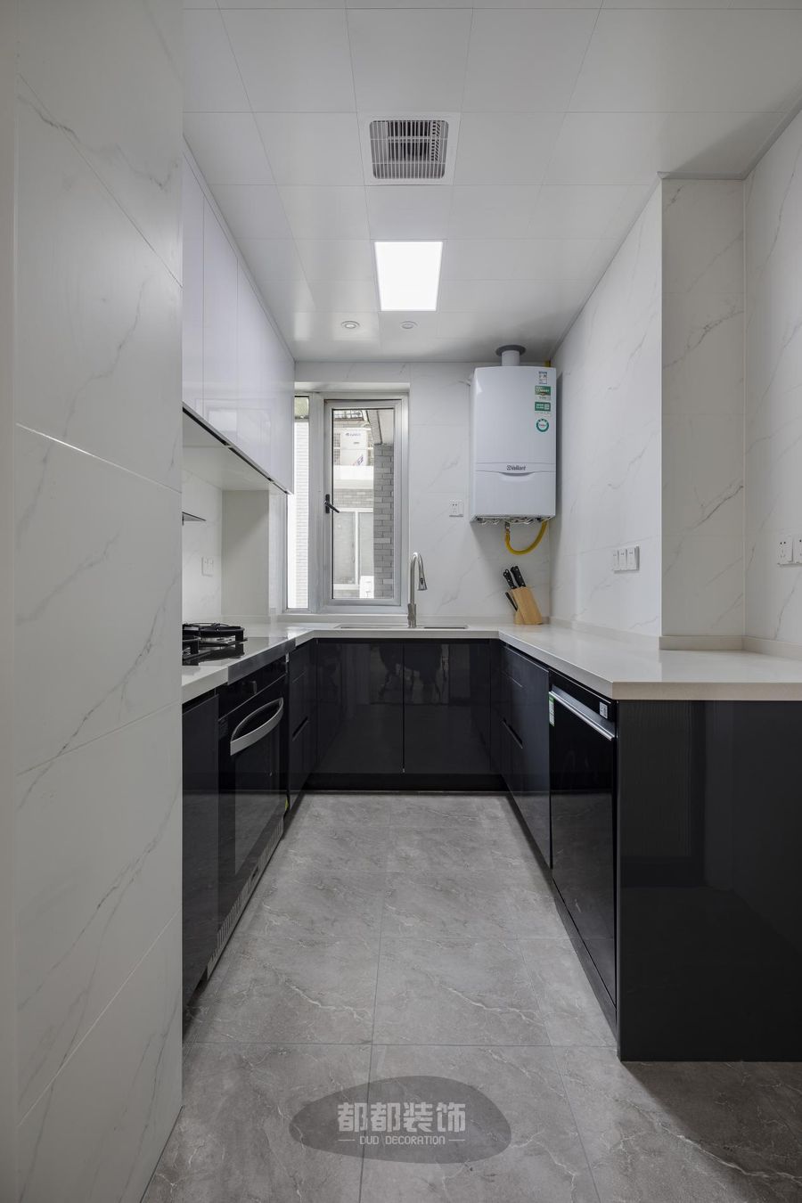 厨房以黑白色为主,空间不算大,但也具有强大的储物空间。吊柜可以容纳日常所需,地柜在储物之余还内嵌了洗碗机,能够满足基本烹饪需求。