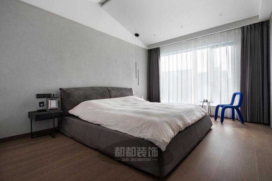 主卧墙面为水泥灰色,给人整体现代工业简约感,布置深棕色绒面床品,优雅协调;克莱因蓝曲线靠椅作为跳色,流畅的造型,时尚百搭。