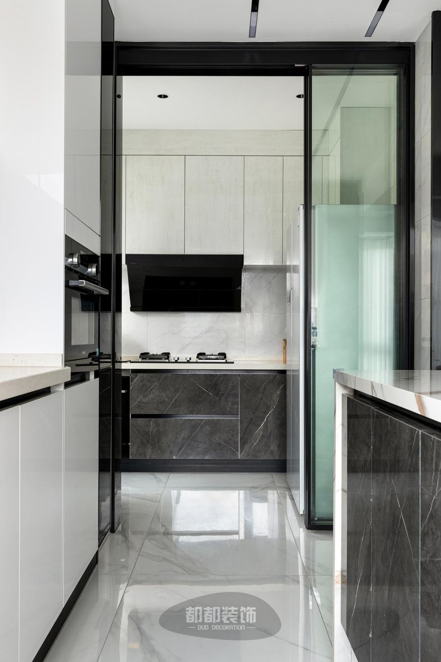 厨房空间以黑白的色调为渲染,干净简约的柜体立面,以体块与线条交叠出优雅的视觉张力,木与岩板进行了融合,将生活的品质感进一步细化、升级。