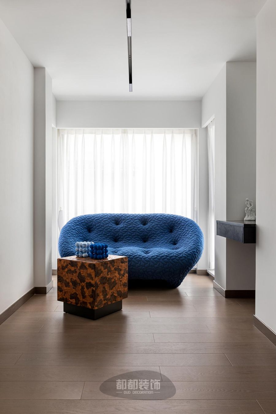 宝蓝色弧形懒人沙发,细腻柔软,闲暇时阅读一本好书,仿佛时光也慢了下来,悄然融化了身与心的压力;玳瑁色立方体茶几装点同色系几何摆件,个性十足;