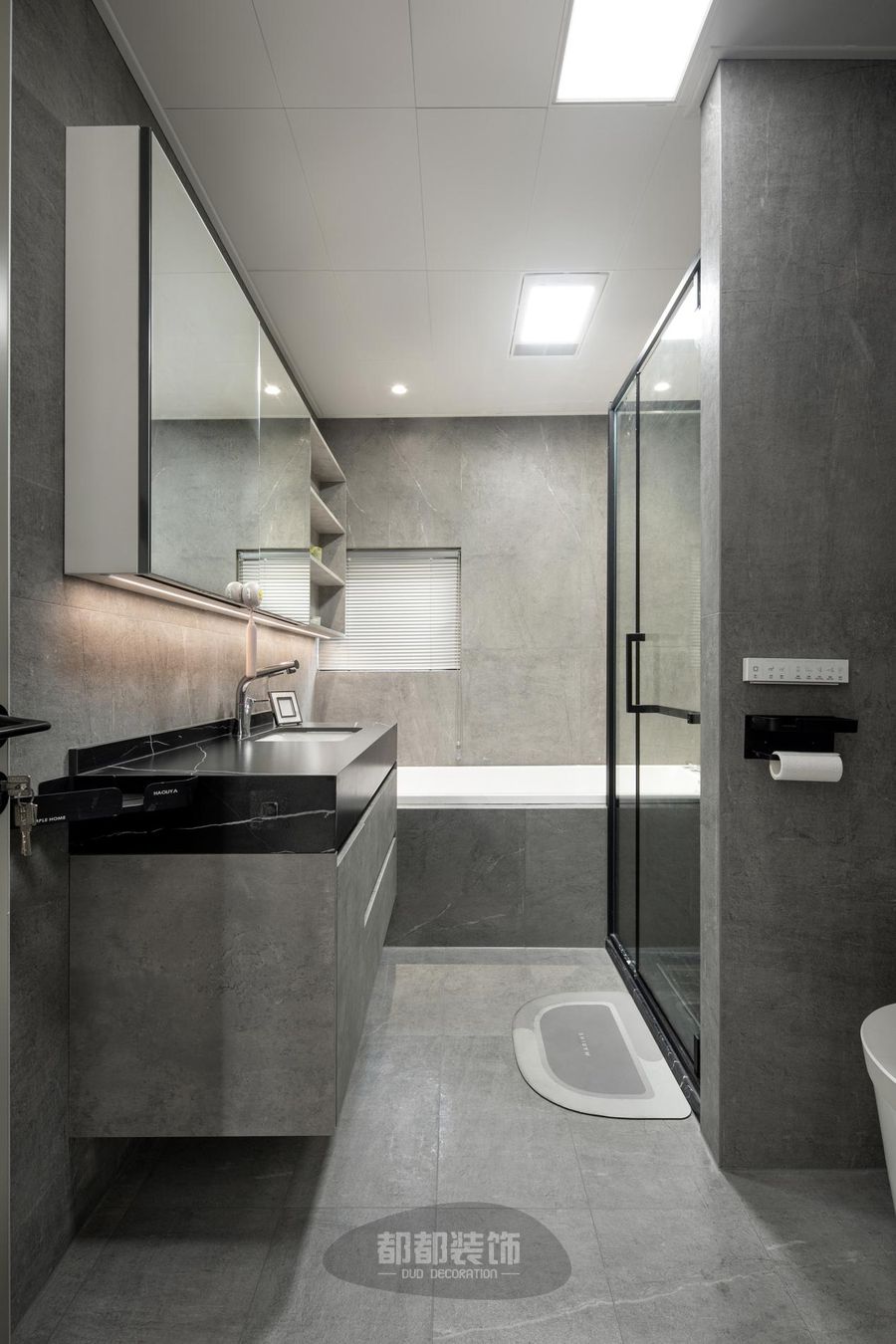 两个卫生间分别灰色、粉色的墙面与地面砖,台下盆+镜柜组合,镜柜底部顶部都装上灯带,侧边加入壁龛,在淋浴区与洗手盆之间也是装上一道玻璃门,干湿分离,呈现出一个现代时尚的卫浴空间感。