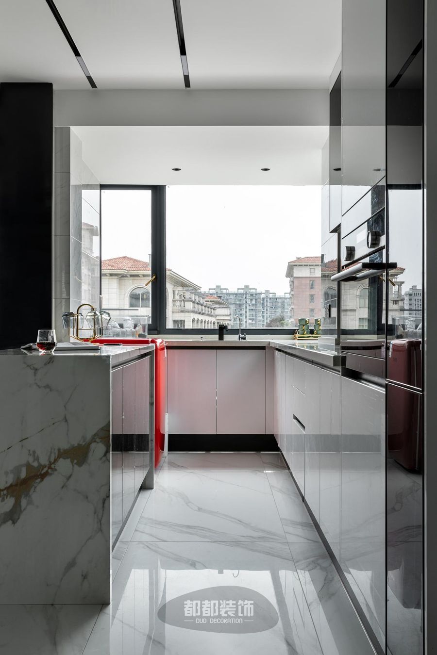 厨房整体呈U型设计,“洗——切——炒”分区,操作流线更流畅;红色小冰箱时尚靓丽、超大窗户视野开阔。