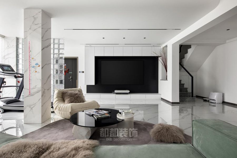 开放式的布局,秉承现代简约的写意风格,于色彩本源中萃取的白与黑,演绎独特高级的韵律美,绿色元素置入其中,激活了空间活力和生机感。