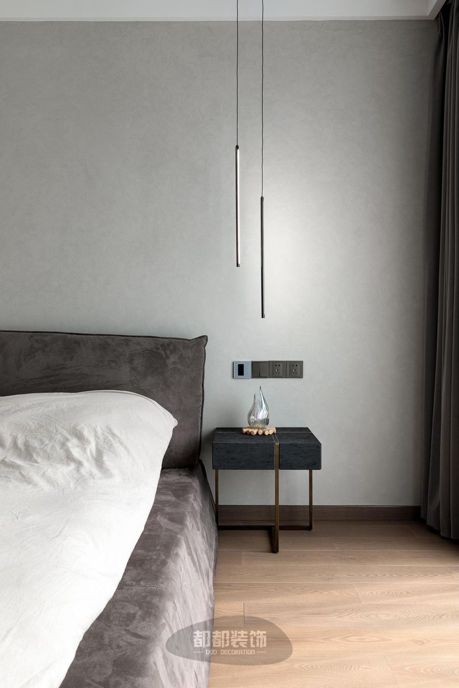 床头柜选择黑橡木与金属框架相结合,玻璃装饰品加以点缀,黑色线性吊灯色向下延伸,让卧室时刻散发摩登、优雅的独特魅力。