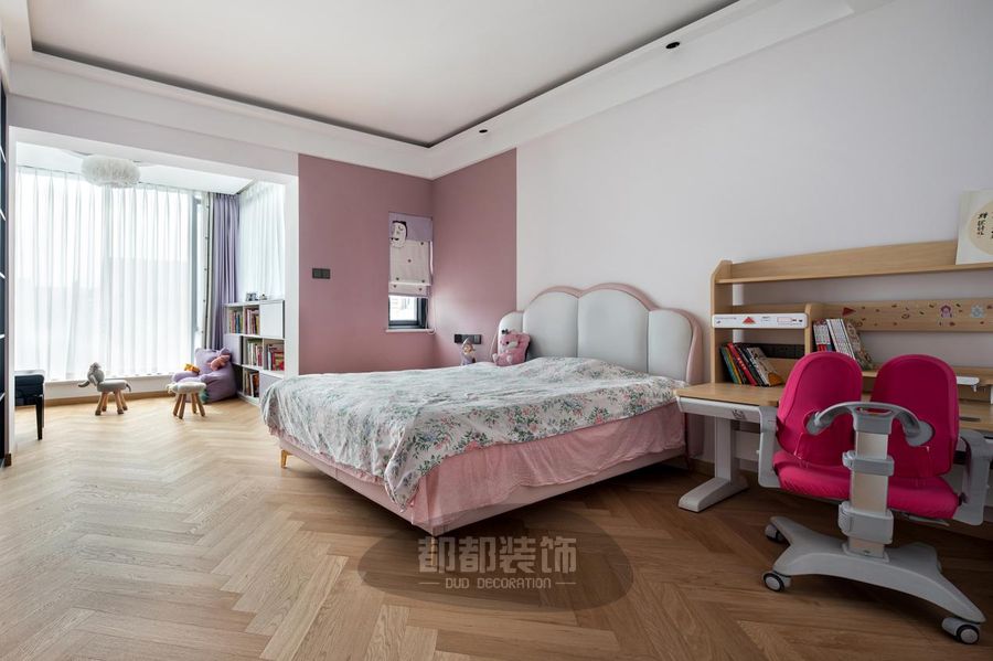 儿童房载入温柔的粉色与纯净的乳白色,浪漫梦幻,又不会过于甜腻,插入定制书桌,简而有序,空间得到合理的规划。
