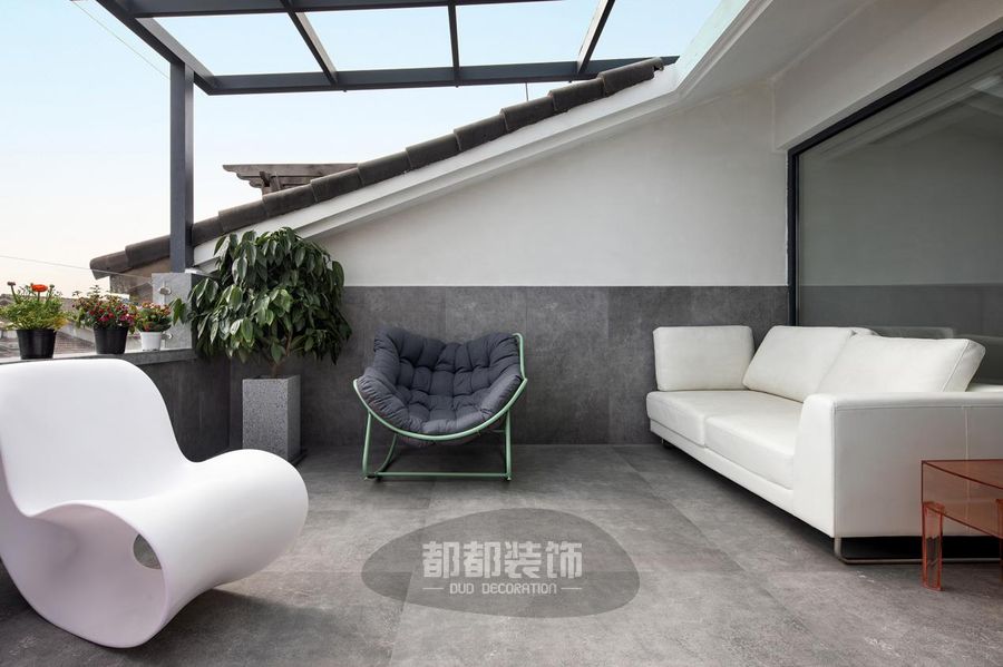 露天阳台区域摆放了一些花木和沙发,既能陶冶情操,也能增加家人一起玩耍的范围。