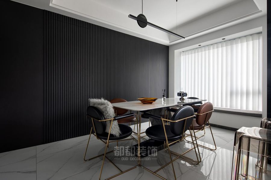 餐厅布置金色铁艺真皮餐椅与大理石亮面餐桌,干净利落,为餐厅的高雅定调,还提高了欢聚畅饮的惬意感;灰色靠垫和混色水果盘的点缀,梳理出优雅而精致的用餐氛围。
