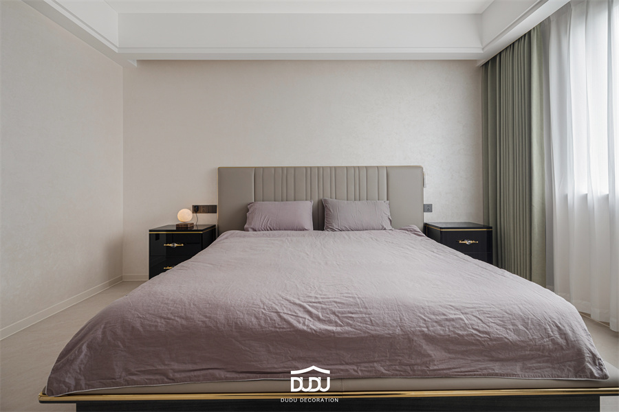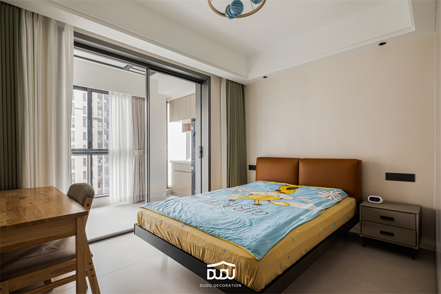 首先映入眼帘的便是占据整面墙的大面积落地窗,轻薄的白色纱帘随风轻拂,让自然光毫无保留地倾泻而入,瞬间点亮整个空间。窗外的景色宛如一幅流动的画卷,与室内的温馨氛围相互交融。