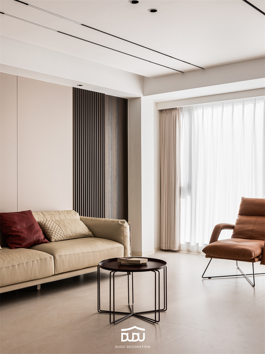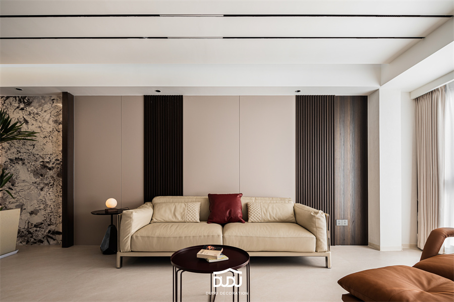 客厅摒弃了传统的主灯设计,整个空间通过巧妙布局的辅助灯光营造出温馨又富有格调的氛围。天花板上,嵌入式筒灯均匀分布,散发出柔和而均匀的光线,照亮整个空间;隐藏在吊顶四周的灯带,发出暖黄色的光晕,为空间勾勒出灵动的轮廓,增添温馨之感。
