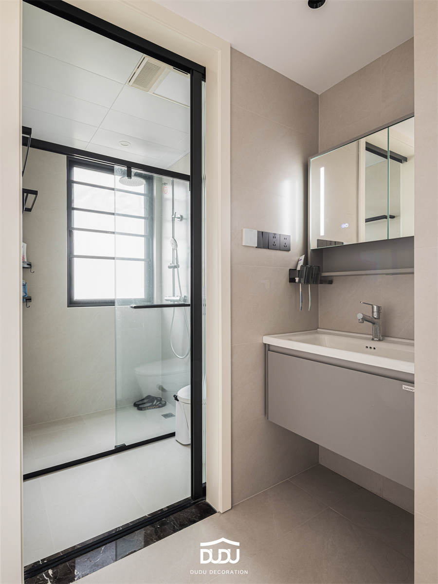 卫生间采用了先进的“三分离”设计,巧妙地将洗漱区、马桶区与淋浴区相互独立,确保各区域空间互不干扰且易于维护。既高效隔绝了气味、湿度问题,也同时保障了空间的私密性和使用安全性,更实现了全家人可以同时便捷使用的功能,大幅提升了使用效率与舒适度。