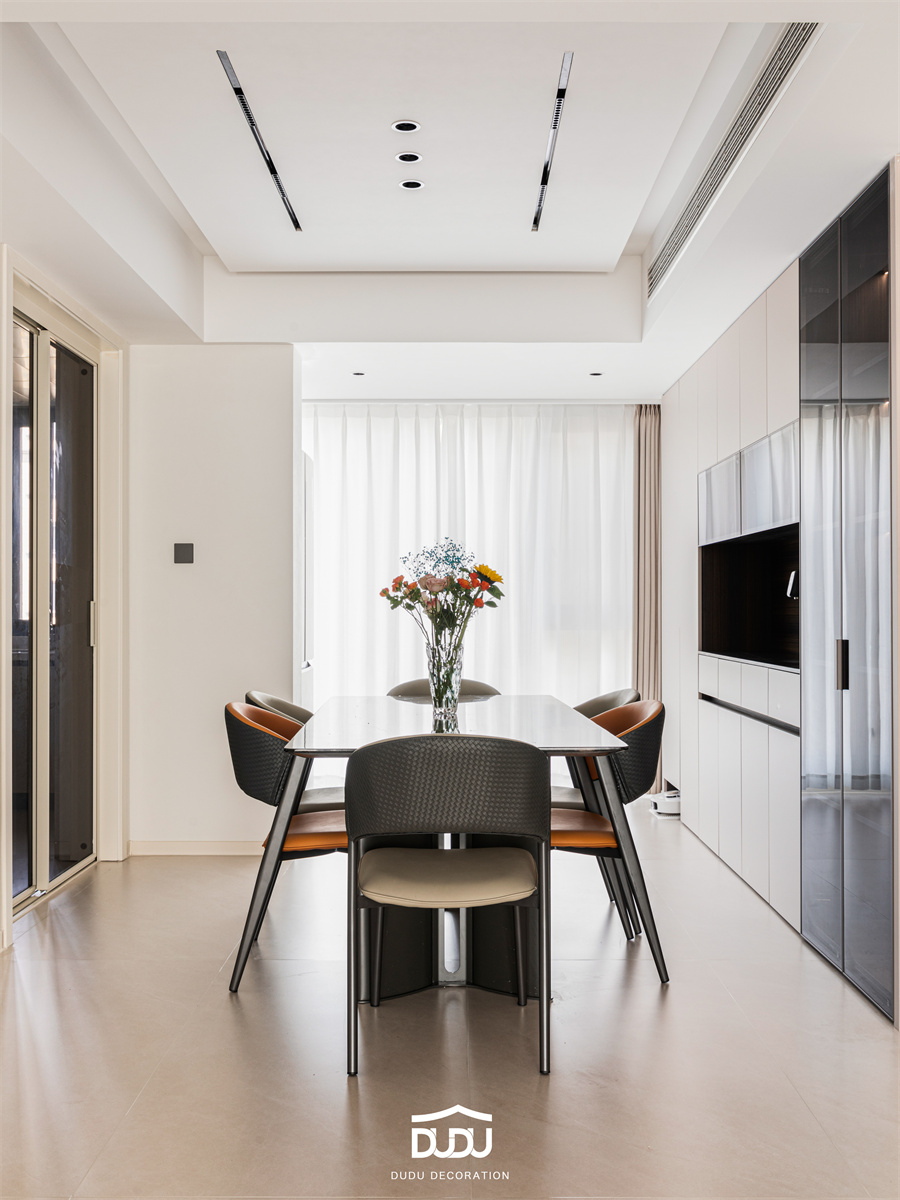 造型简约的六人位岩板餐桌。岩板材质的桌面平整光滑,触感冰凉,其独特的纹理细腻而富有质感,不仅耐污耐磨,还为餐厅增添了一份时尚与精致。流畅的线条勾勒出简洁的桌型,搭配上造型独特的金属桌腿,稳固又极具现代感,展现出刚与柔的完美结合。