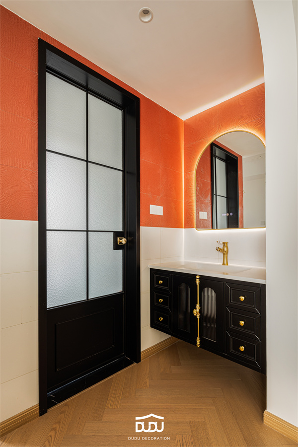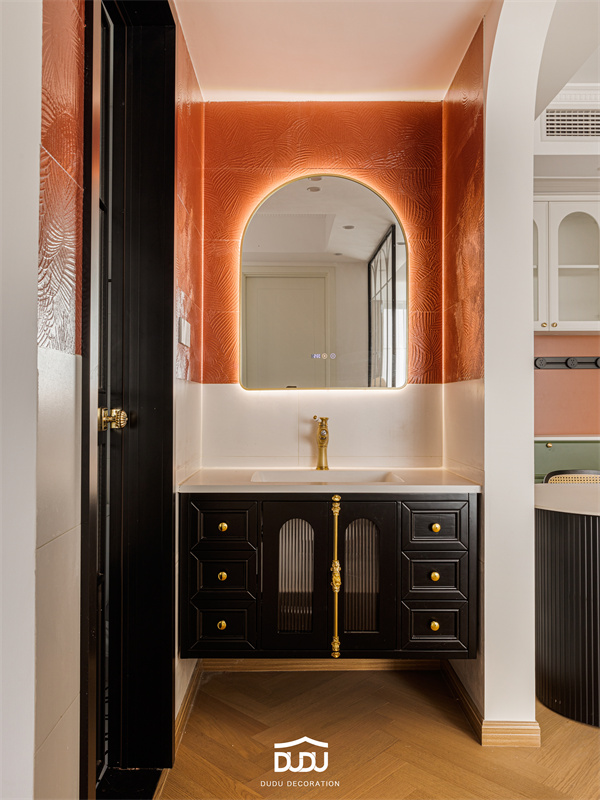 干区镜子后的壁灯散发着柔和的光芒,为这里增添了一份复古氛围,亮红色背景和黄铜元素的精致点缀,则在低调中尽显奢华与美学的融合。湿区采用了复古精致的小花砖,令原本单调的空间变得丰富而有立体感,更有生活乐趣。
