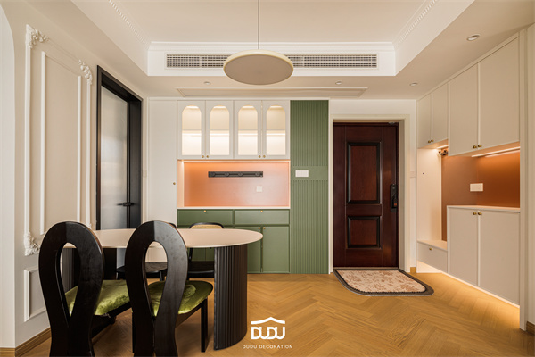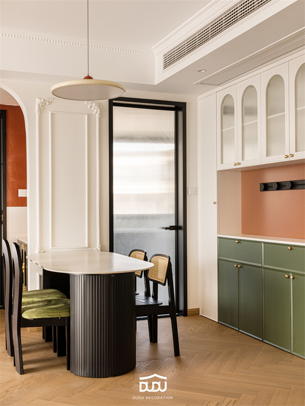 餐厅鱼骨拼的木地板,因为有颜色渐变所以更显高级感,黑色原木餐椅则是给空间增加了朴素气息;橙红+墨绿餐边柜,整体设计色调温暖活泼,舒适感由然而生。