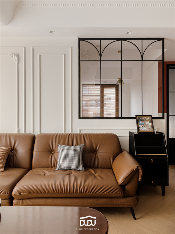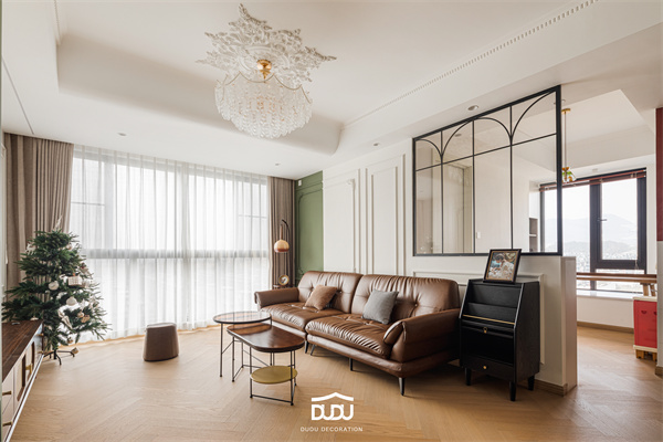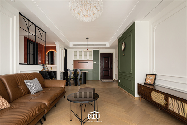 客厅以奶油色为基底,利用pu线条、角花和复古灯饰等法式元素,为空间奠定了雅而不缀的视觉感受。同时利用复古绿+棕色系元素打破精装房的单一乏味,给家注入独特精致的味道。