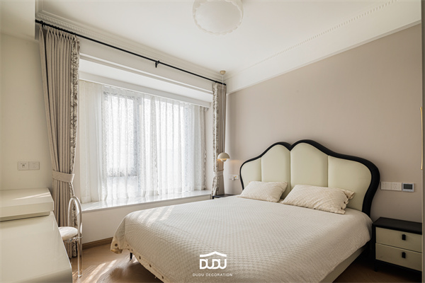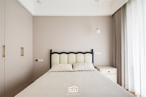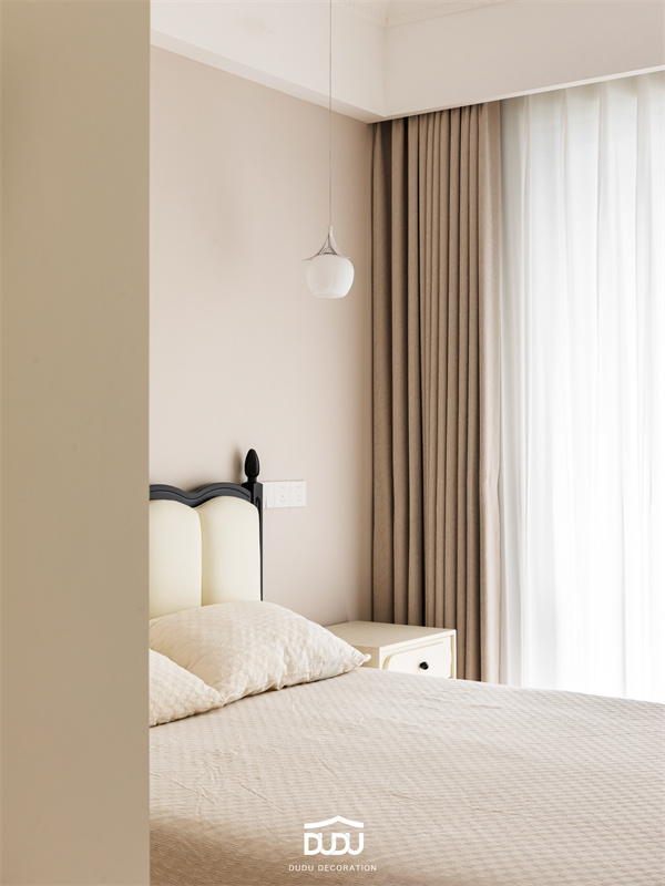 次卧整体采用奶杏色结合纯洁的白色,给予空间干净明朗的通透感;从软包床到法式花苞吊灯,精致有味的轻法式元素,为睡眠空间带来了浓郁的艺术雅韵。