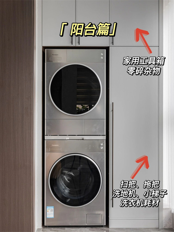 生活阳台可以做顶天立地的收纳柜,洗衣机耗材和清扫用具都可以放进去。