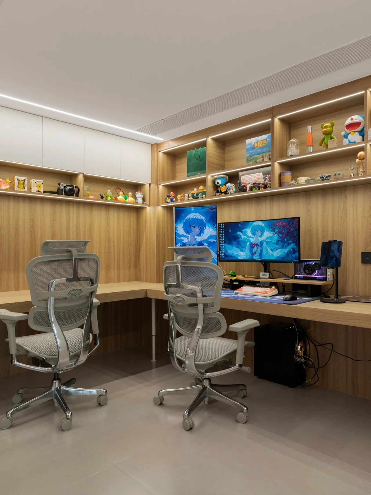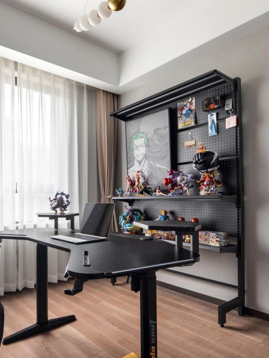 同样还可以在书房买个成品柜,或者做定制柜的同时专门做出一个用于展示潮玩手办的区域,还可以根据物品的尺寸去规划专属的展示位。