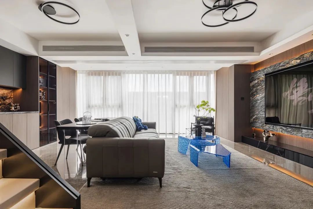 推荐大家的电视背景墙直接刷乳胶漆,搭配一排悬浮柜或地柜,满足客厅遥控器或电子设备的基础收纳需求即可。