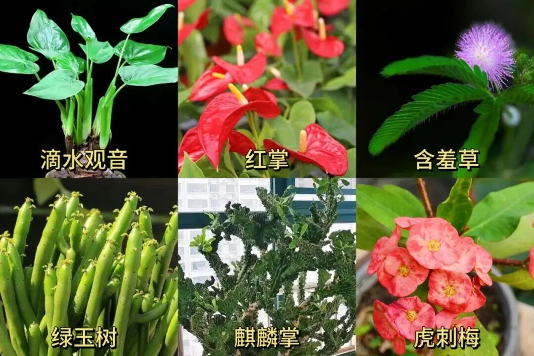 滴水观音、红掌、含羞草、绿玉树、麒麟掌、虎刺梅