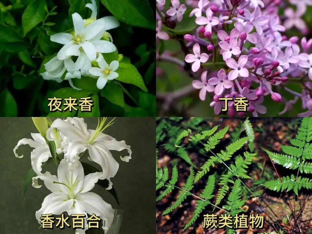 夜来香、丁香、香水百合、蕨类植物
